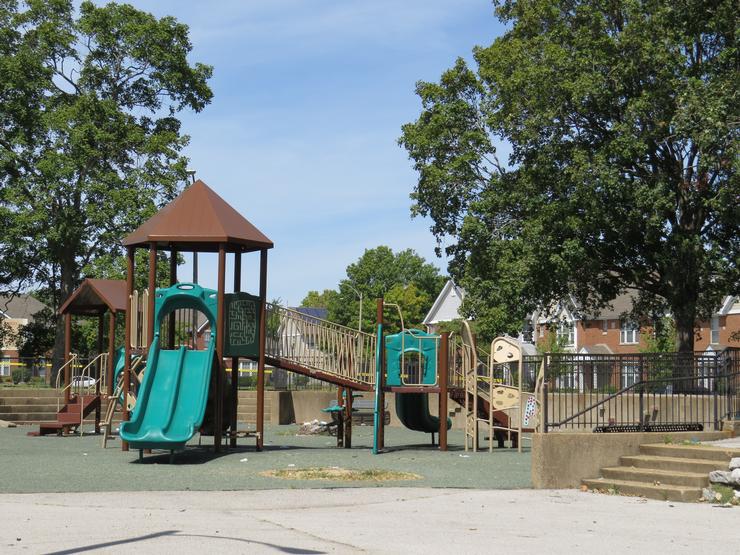 Mid-century park that is heavy on the concrete and feels very urban. The 1960's parks don't as much seek to provide a green space, natural getaway as much as they intend to be a city park, a complement to their surroundings. Even the horseshoe pits are surrounded by concrete.