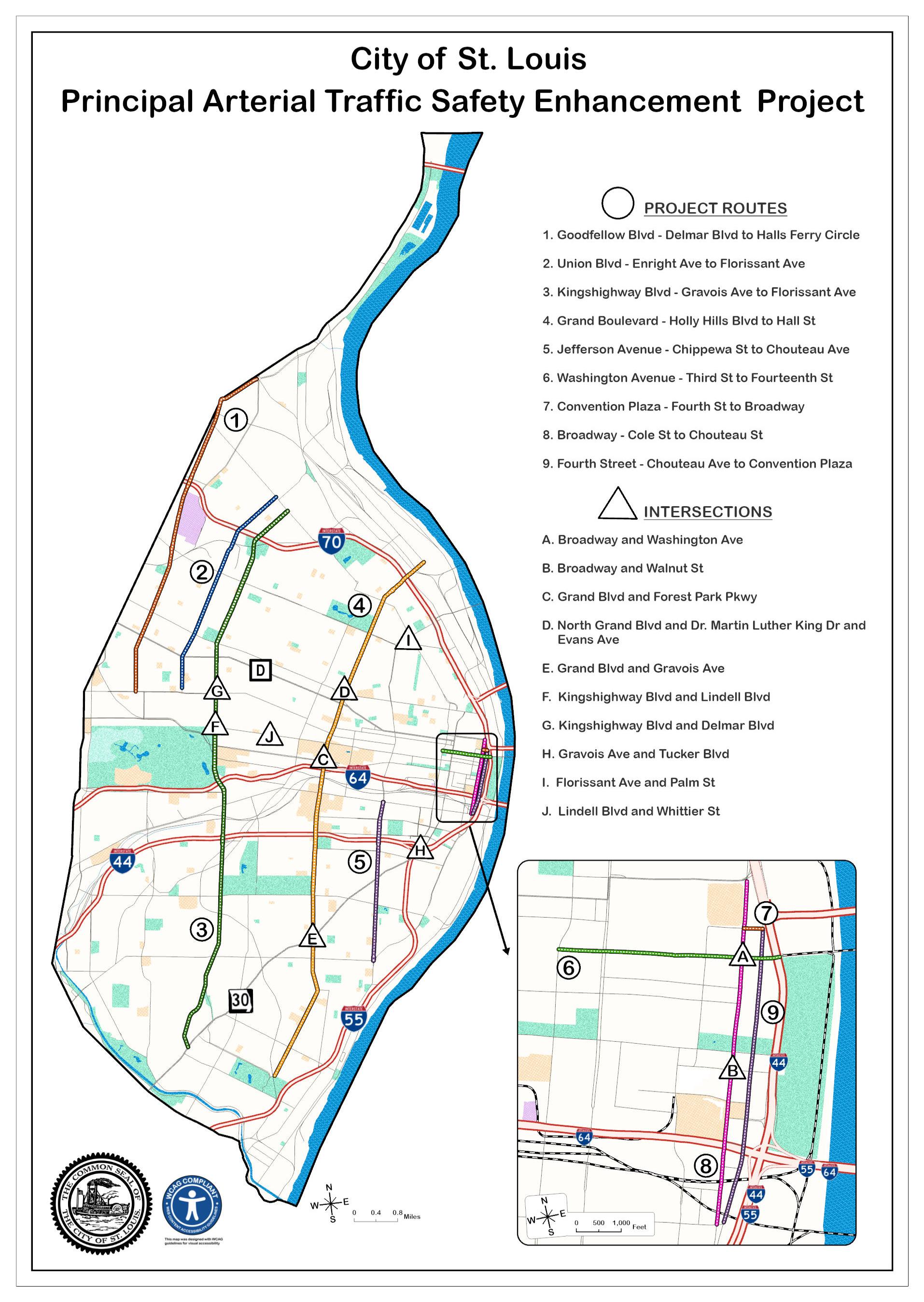 The City of St. Louis is pursuing over $46,000,000 in improvements to address speeding, crash concentrations, and pedestrian and alternative movements throughout approximately 30 miles of corridors and select intersections in the City.