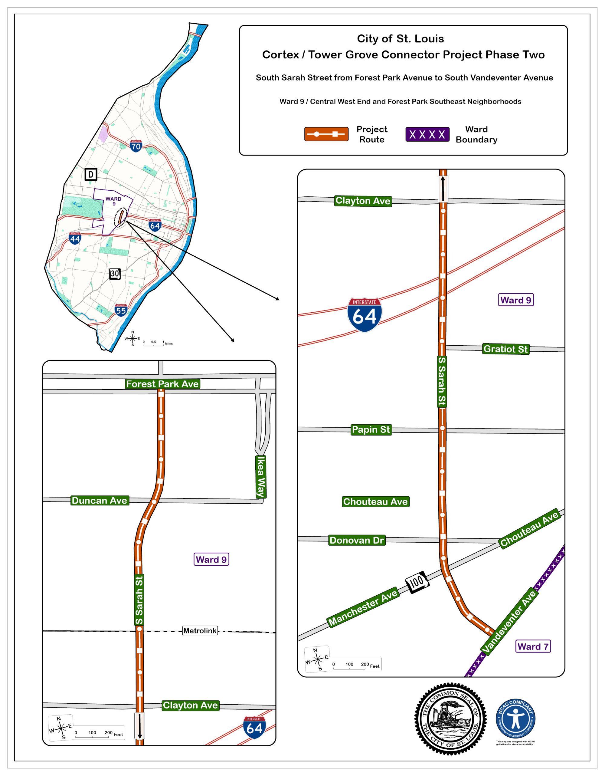 The 0.36 miles of the project corridor are on Sarah Street from Forest Park Avenue on the north to Vandeventer Avenue to the south. Phase 2 of this project links to the improvements undertaken in Phase 1, which includes Tower Grove Avenue from Magnolia Avenue to Vandeventer Avenue, and from Vandeventer Avenue from Tower Grove Avenue to Sarah Street.