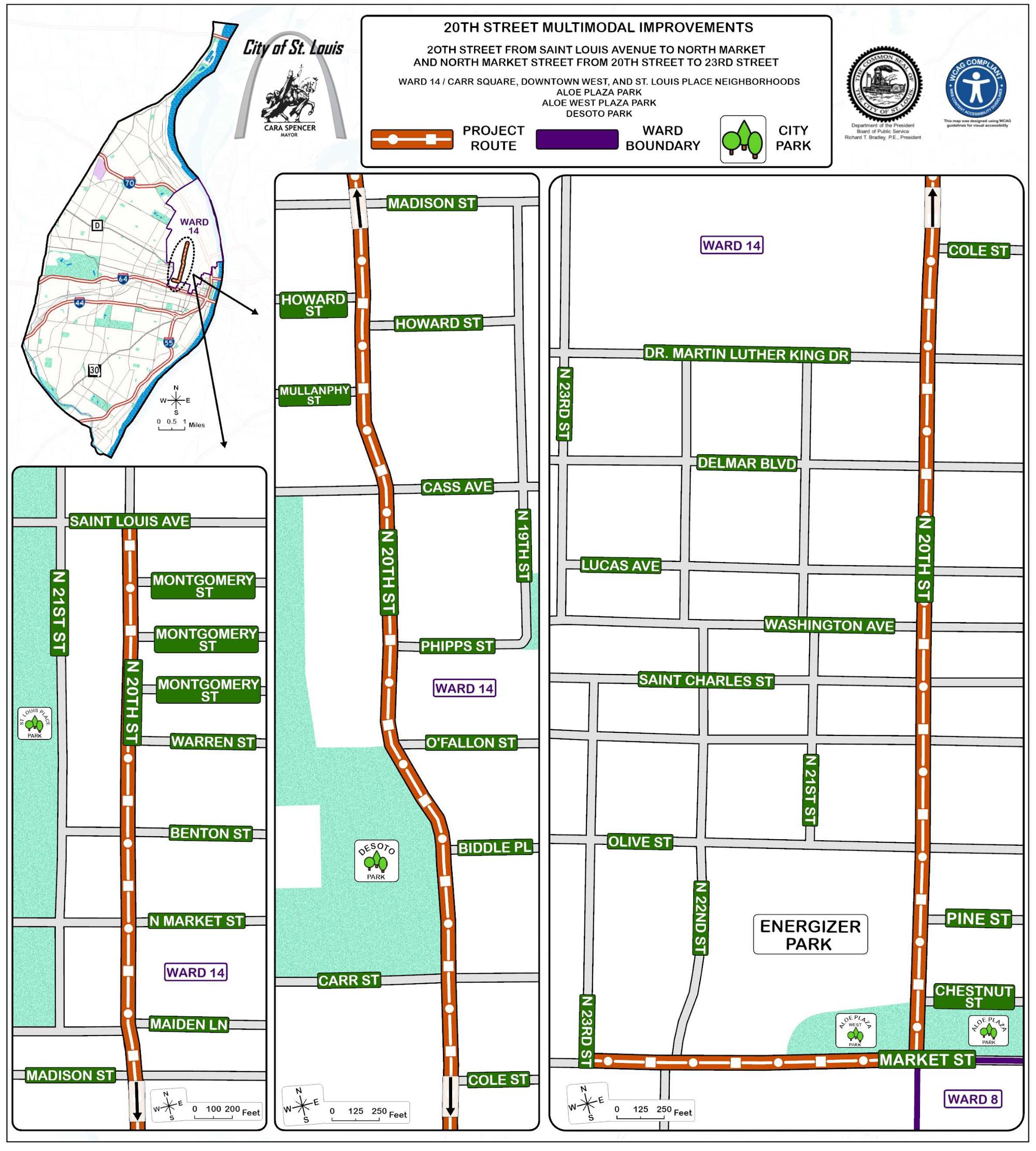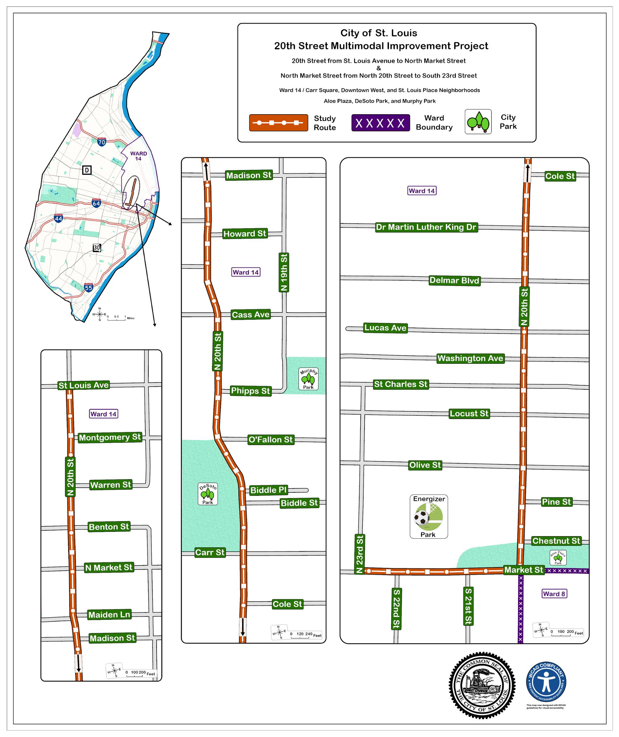 The 1.64-mile project corridor runs along 20th Street from St. Louis Avenue in the north-to-North Market Street in the south, and along North Market Street from 20th Street in the east to 23rd Street in the west. The existing bicycle infrastructure on 20th Street is inadequate for future transportation needs and currently creates a high-stress environment for cyclists. In an area where 41% of residents rely on transit, this project bridges the gap between Downtown and North St. Louis by establishing a low-stress multimodal corridor that benefits the entire community. It also connects Great Rivers Greenway’s (GRG) Chouteau Greenway, the City’s planned cycle track ending at Market Street, and designated bicycle routes along Chestnut Street, Olive Street, Washington Avenue, and St. Louis Avenue.